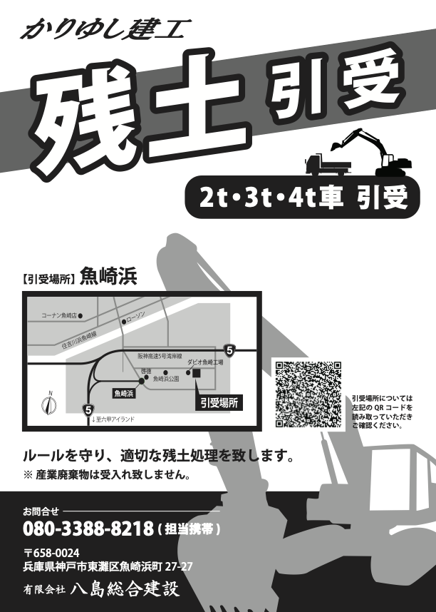 かりゆし建工 残土処分事業 兵庫県神戸市東灘区魚崎浜に残土中継所を設置 建設現場や外構工事などで出た残土の処理にお困りではないでしょうか? 「かりゆし建工」では、兵庫県神戸市東灘区魚崎浜に残土中継所を設置し、残土の受け入れを行なっております。2t・3t・4t車での引受が可能です。 兵庫、大阪、個人、法人に限らず残土の受け入れを行なっておりますので、価格や受け入れに関するご質問等、お気軽にご相談ください。 営業時間 8:00〜17:00 電話番号 080ー3388ー8218 受入場所 兵庫県神戸市東灘区魚崎浜町27–27 ※「産業廃棄物」は、お受け入れできません。 魚崎浜残土処分場(兵庫県神戸市東灘区) Group 八島総合建設( 土木工事事業 ) 会社名:有限会社 八島総合建設住所:〒657-0825兵庫県神戸市灘区中原通6丁目5ー1代表: 八島 秀介電話番号:078-871-1580 株式会社 Sol( 総合建設会社 ) 会社名:株式会社 Sol住所:〒657-0836兵庫県神戸市灘区城内通2丁目5ー19代表: 八島 秀介電話番号:078-801-5566
